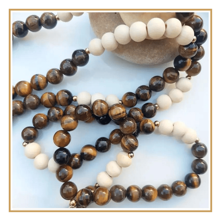 Sinergias do Japamala: contas de olho de tigre + contas de madeira + meru de olho de Tigre + amor + good vibes